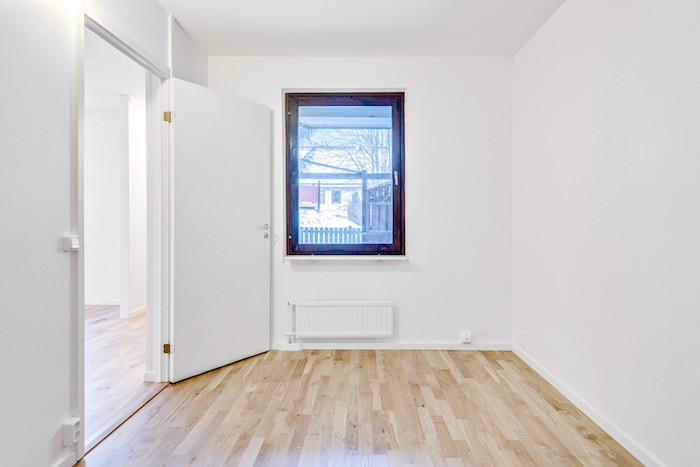 Sovrum i vitt med ekparkett
